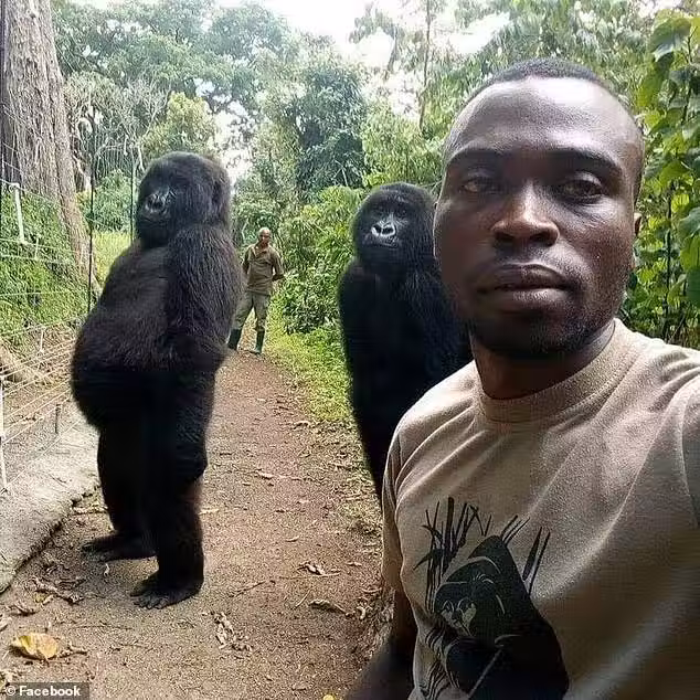 在剛果的維龍加國家公園(Virunga National Park)內,一位負責巡視、避免盜獵者的巡守員和大猩猩自拍,按下快門的瞬間,大猩猩彷彿手插口袋,擺出人類的姿勢,帥氣挺拔的模樣瞬間紅了!
