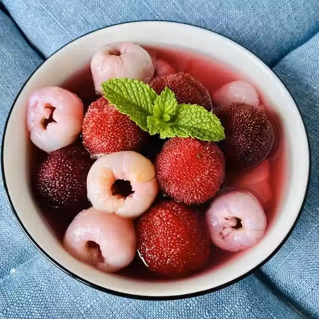 加楊梅、冰糖、清水,大火煮沸轉中火煮10分鐘,放荔枝繼續煮1分鐘;