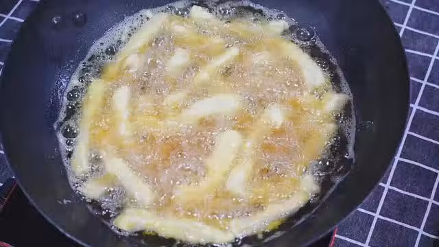 2、油溫9成熱放入裡脊肉復炸,炸至金黃撈出備用(復炸是讓裡脊肉外酥里嫩);