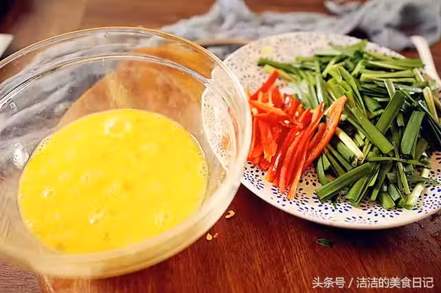 4.在蒸餃子皮的時候,我們來把韭菜和辣椒都切成段。然後往碗中打入3個雞蛋加一點點鹽打散