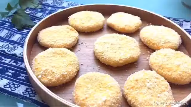 做好的,平放在盤子裡,等待油炸!麵包糠本身是比較乾爽的配料,有麵包糠裹在外層,一方面可以讓做好的南瓜餅更加的脆爽,另一方面在油炸的過程中可以防止炸鍋,可謂是一舉兩得!