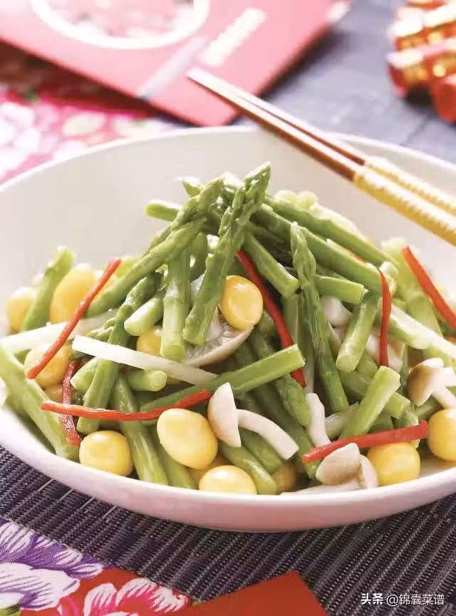 銀杏 60 克,青蘆筍 300 克,蟹味菇 50 克,薑絲 10 克,紅辣椒絲 10 克