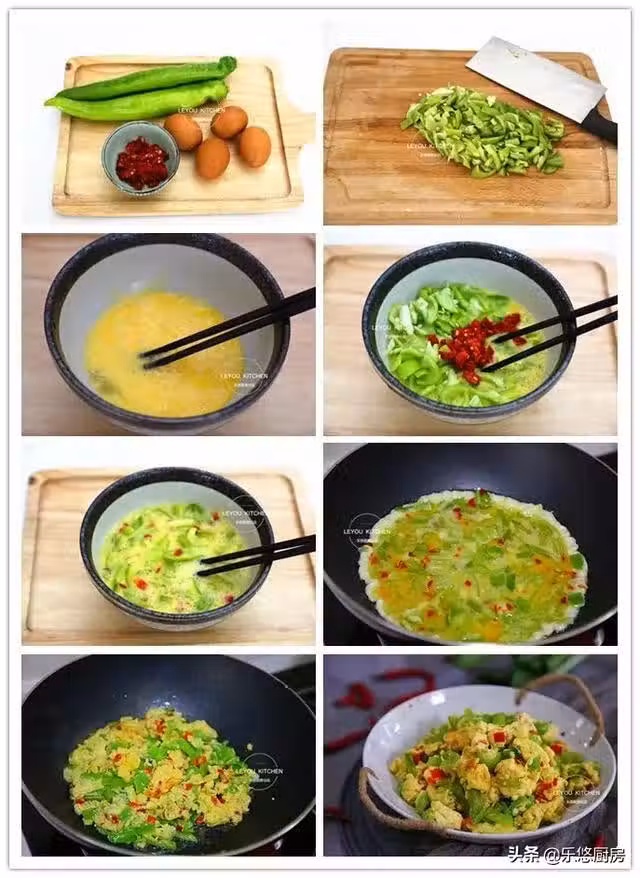 第七步:滑炒至雞蛋凝固、尖椒稍有變軟,即可關火。然後淋幾滴香油,裝盤盛出就可以了。