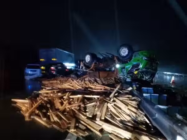 事故發生時,其中一輛載木材羅厘失控翻覆,整輛羅厘橫趟大道上,造成大道出現堵塞。