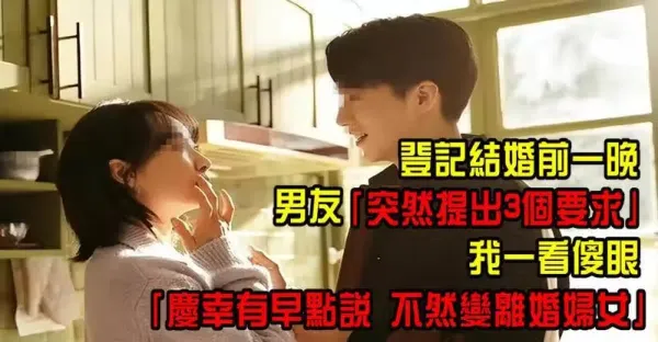 登記結婚前一晚!男友「突然提出3個要求」 我一看傻眼:「慶幸有早點說,不然變失婚婦女!」