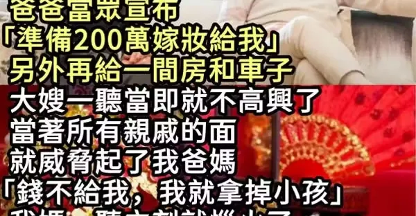 爺爺的生日宴上,爸爸當眾宣布「準備200萬嫁妝給我」另外再給一間房和車子,大嫂一聽當即就不高興了,當著所有親戚的面就威脅起了我爸媽,「錢不給我,我就拿掉小孩」 我媽一聽立刻就惱火了,下一秒媽媽說的話讓大嫂直接愣在了原地