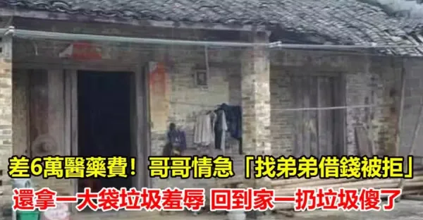 差6萬醫藥費! 哥哥情急「找弟弟借錢被拒」還拿一大袋垃圾羞辱 回到家一扔垃圾傻了