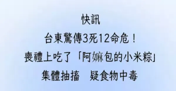 快訊/台東驚傳3死12命危!喪禮上吃了「阿嬤包的小米粽」集體抽搐 疑食物中毒……