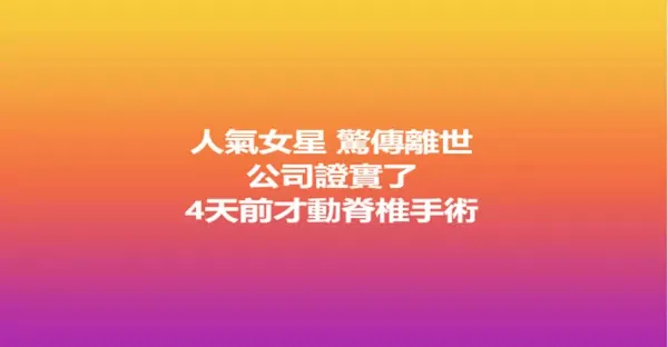 新竹人氣女星「驚傳離世」公司證實了,4天前才動脊椎手術