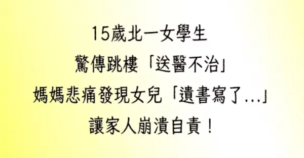 快訊/15歲北一女學生驚傳跳樓「送醫不治」!媽媽悲痛發現女兒「遺書寫了...」讓家人崩潰自責!