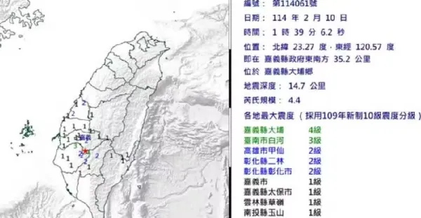 又震了!嘉義大埔凌晨「規模4.4地震」10縣市有感!