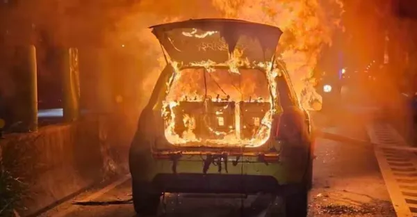 新北火燒車意外!轎車行駛途中突冒煙、燒成火球 駕駛棄車逃生