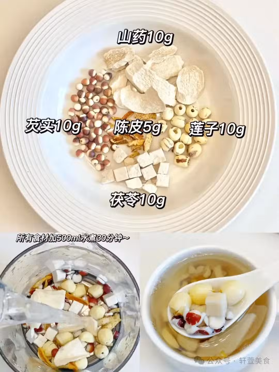 山藥10g➕茯苓10g➕蓮子10g➕芡實10g➕陳皮1片