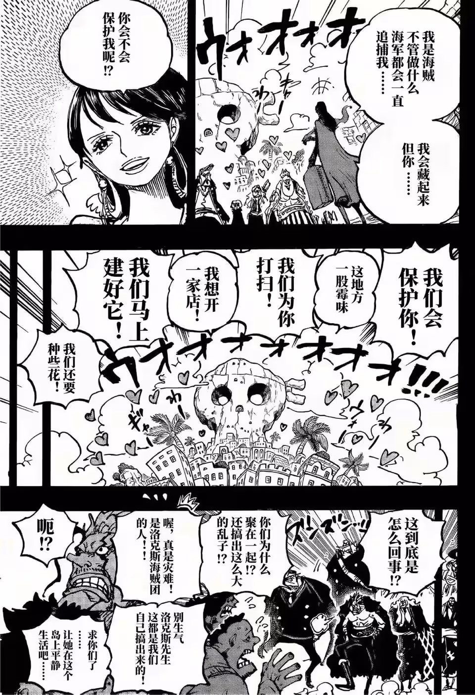 漫畫最新一話的標題是傳說的酒吧,這是指夏琪在蜂巢島開設酒館成為傳說的存在。扉頁小故事是小菊,大和等人拜祭跟凱多交戰而戰死的前輩,後面有凱多的雪人,這是烏爾緹堆積的雪人。