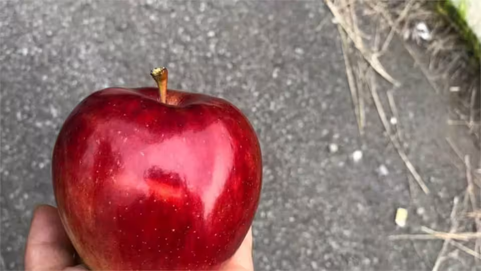 原PO在X發文分享自己5日經過青森縣弘前市時,當地果農從家中果樹摘下自種的蘋果相贈,他拍下「驚艷模樣」後特地分享給網友看。只見手中的蘋果外型飽滿完美、鮮紅欲滴,外皮的「天然果蠟」在日光照射下晶亮璀璨、色澤艷麗,如「紅寶石」般耀眼奪目。