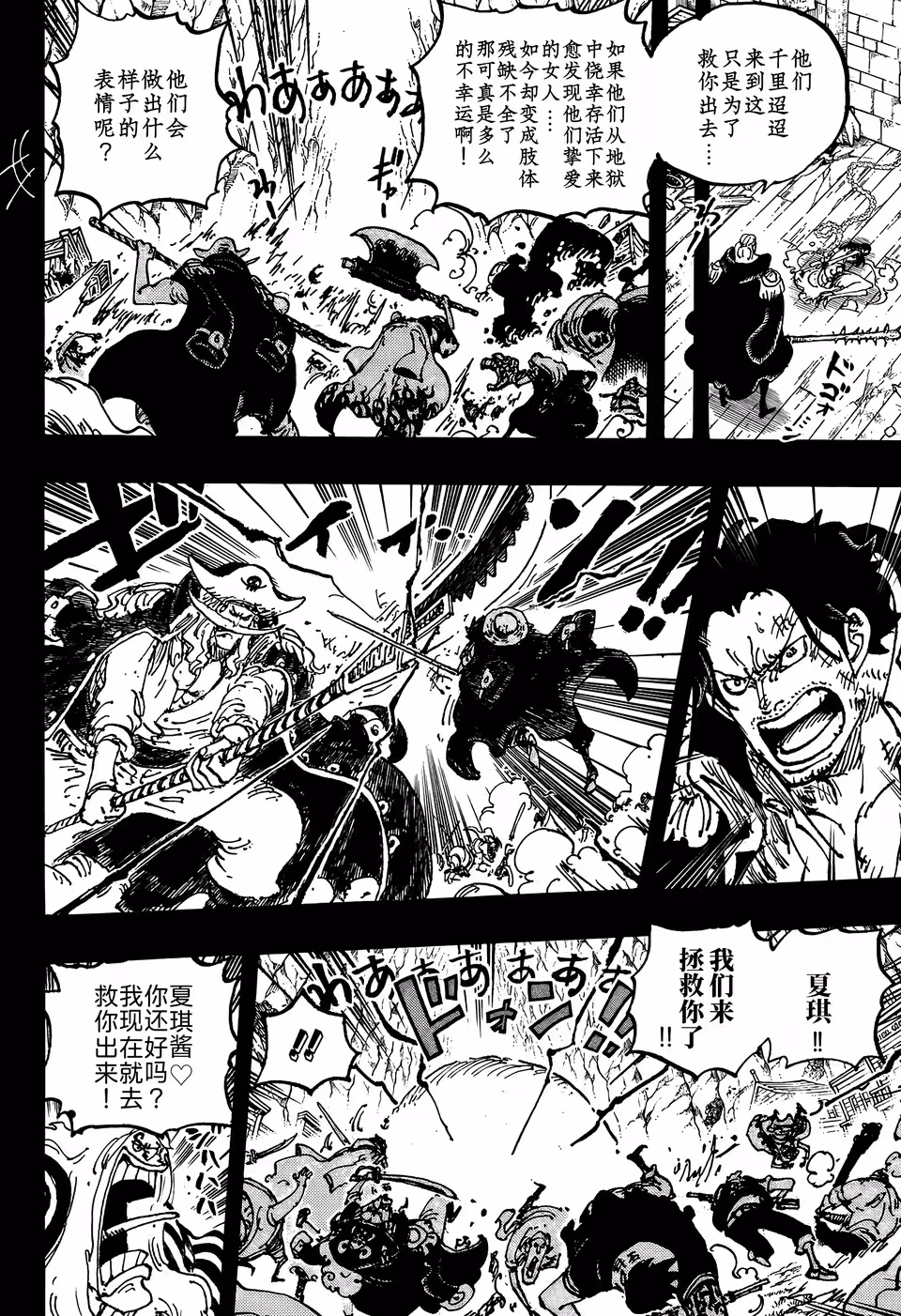 龍也看到了自己的老爸,大媽使用了火焰風暴攻擊卡普,威力十分強大,不過卡普只是被燒成黑炭,一點傷害都沒有。大媽看到卡普沒有受傷,只能全力逃跑了,瑪菲宮以為龍死了,龍抱起孩子逃跑,神之騎士團還在獵殺原住民和海賊。