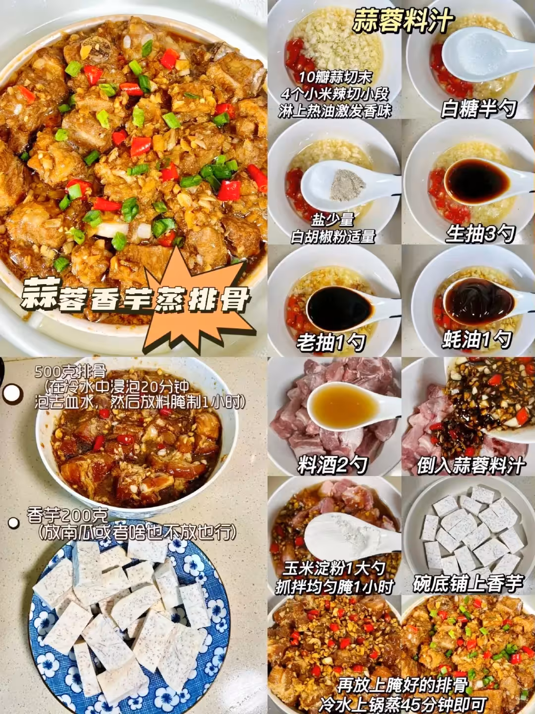★1、蒜蓉香芋蒸排骨:以蒜蓉和香辛料烤制的排骨,香辣誘人,外焦里嫩。